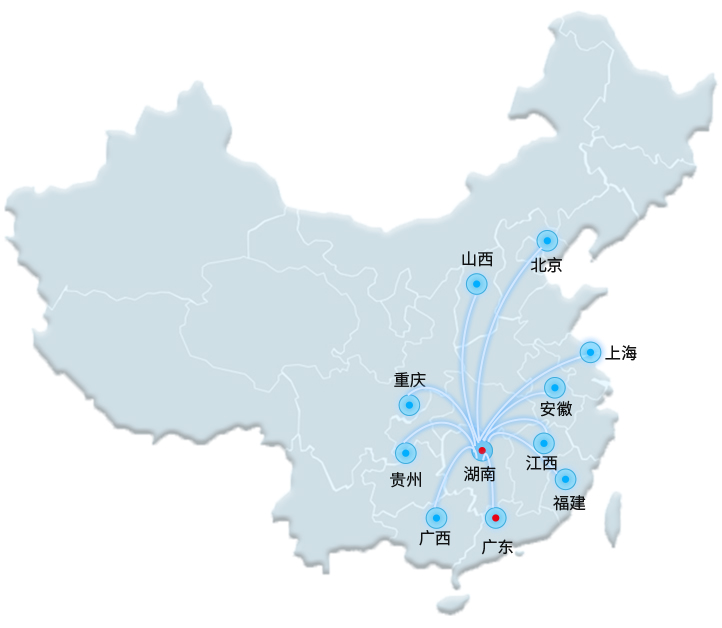 深耕湖南、广东,布局京津、山东、江浙、安徽、江西、山西,战略进入上海、重庆、贵州、广西、福建。